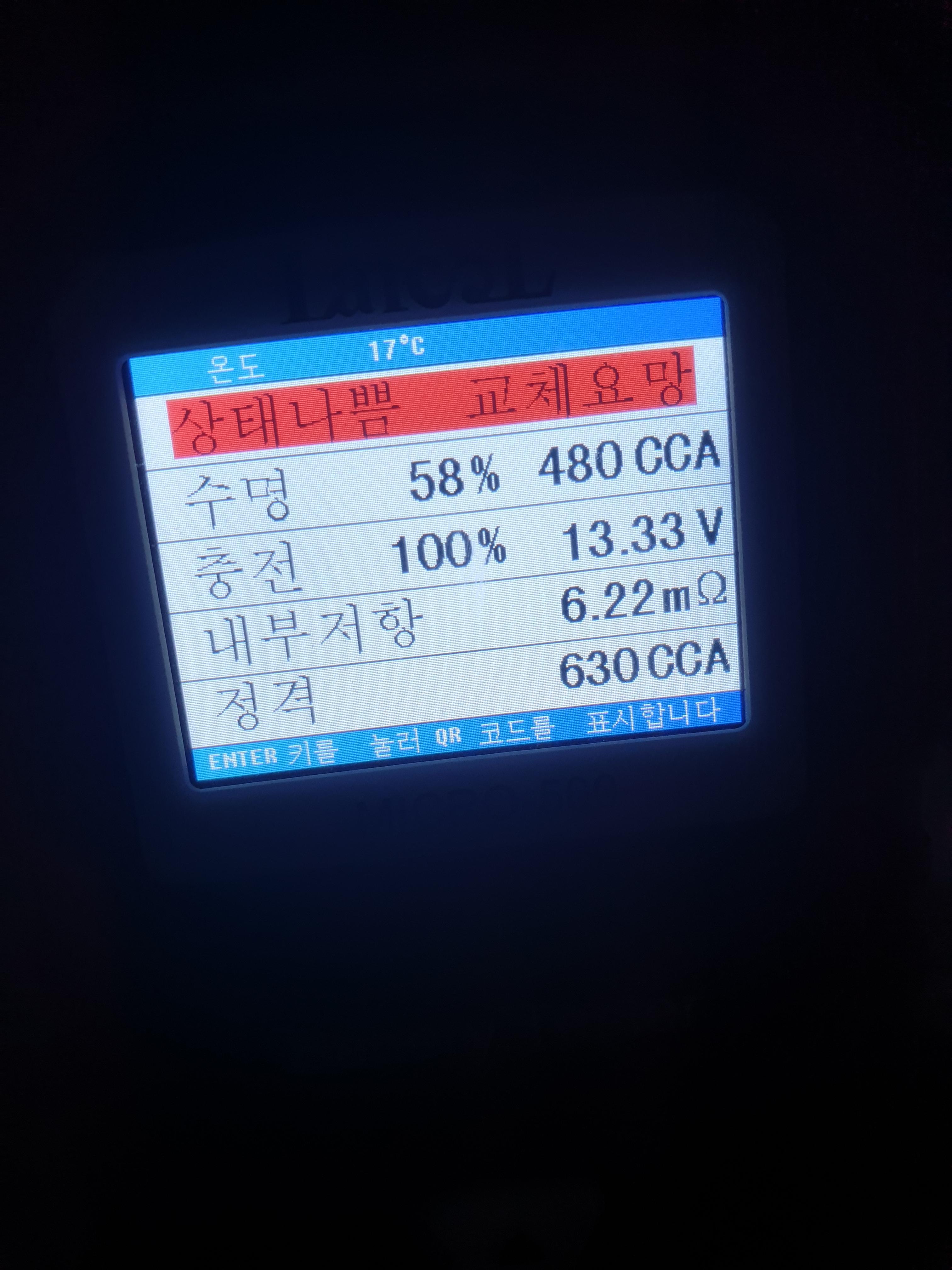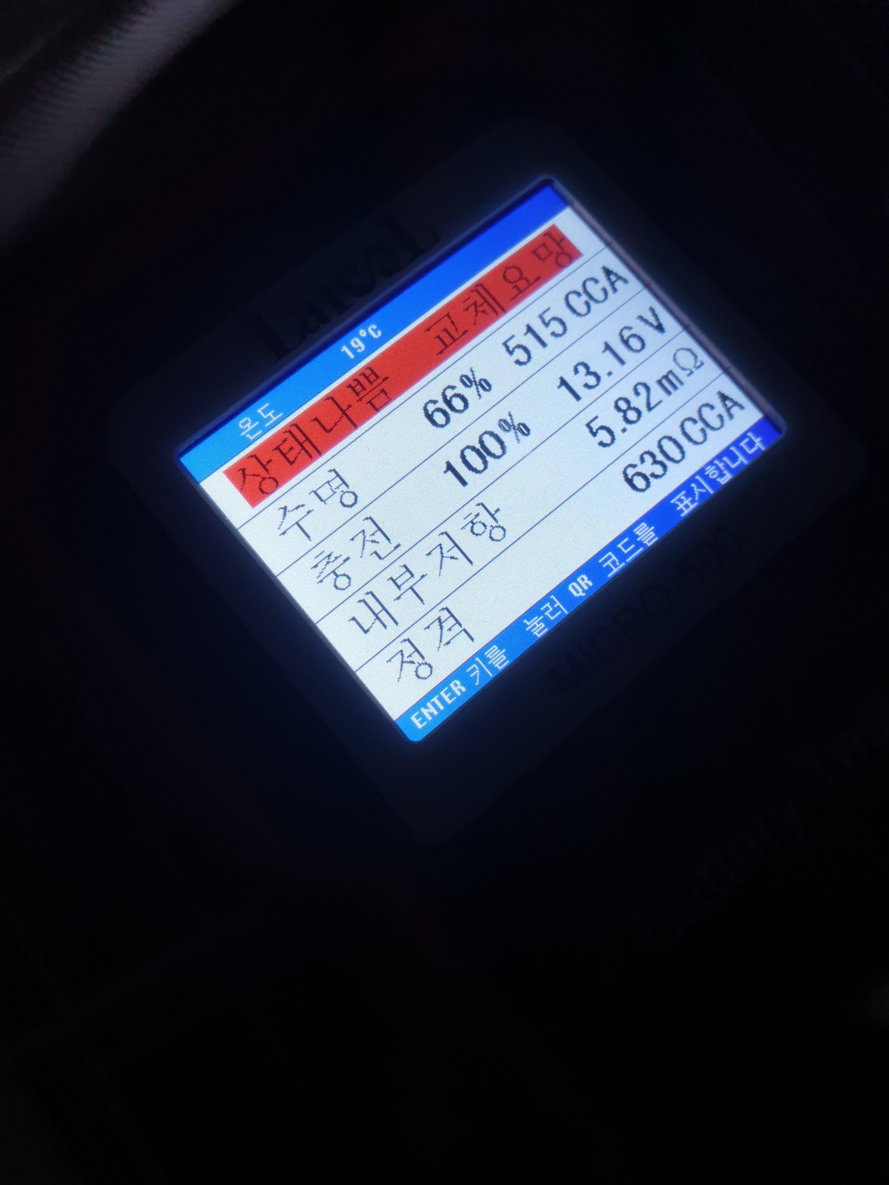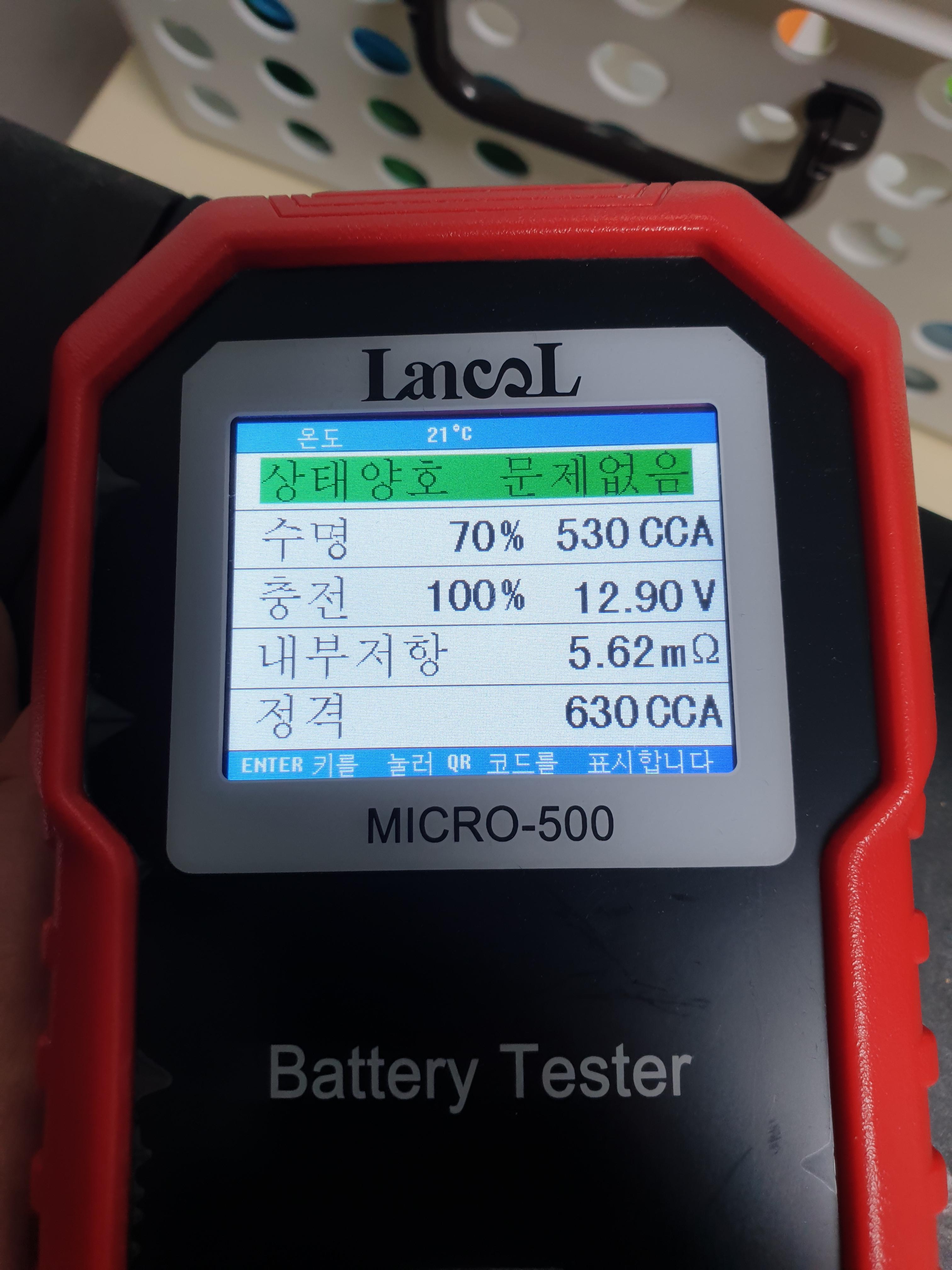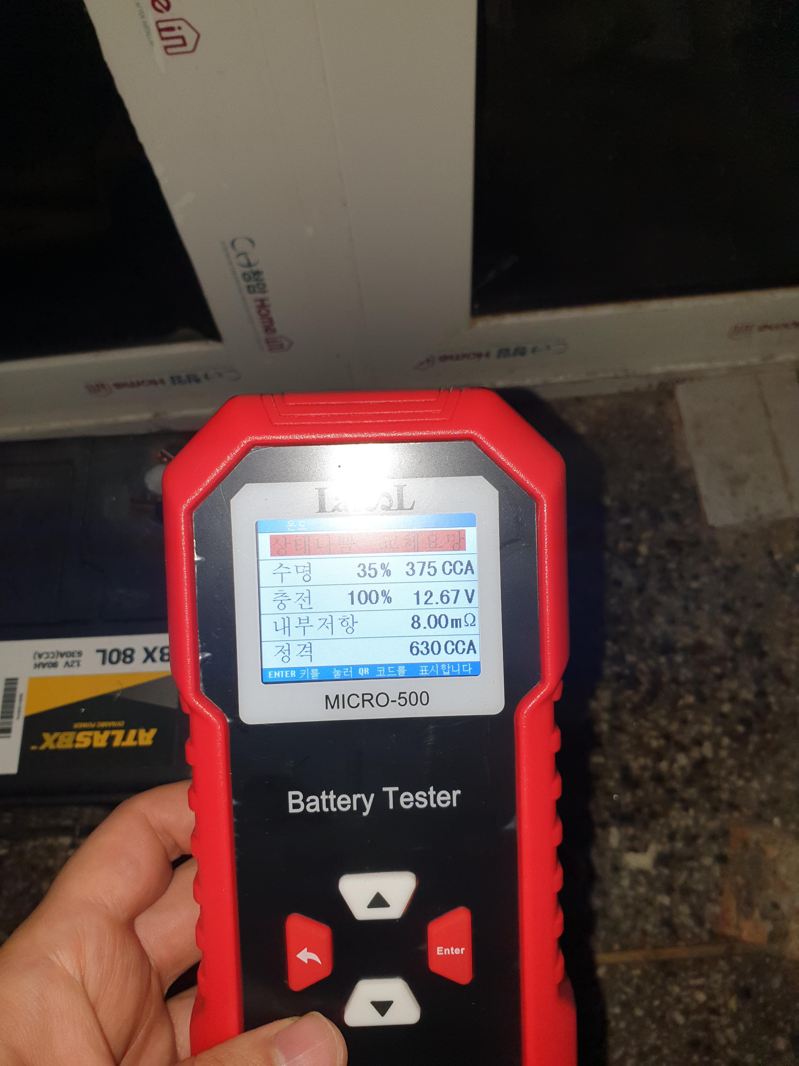 차 배터리 극성에 맞게 케이블을 연결하면 자동으로 전원이 켜지고 배터리 종류, CCA값을 입력하면 위 사진처럼 배터리 상태를 알 수 있게 된다. 충전기로 충전을 시킨 상태라서 충전은 100%이지만 수명이 35%에 불과한 상태였다. 복원기로 몇 번 복원을 시켜봤으나 살아나지는 못해서 그냥 배터리를 교체를 했다. 새 배터리는 수명이 괜찮다고 나오는 걸 보니 테스트 정확성은 괜찮아보였다. 당시 가격이 3만원대로 기억을 하는데 좀 비싸지만 배터리 한 개 가격이 10만원 정도인걸 감안하면 배터리 충전 상태가 불량인지 아예 수명이 다 된건지 알 수 있게 해주는 제품이라서 하나쯤 사놓을만 하다는 생각이 든다.