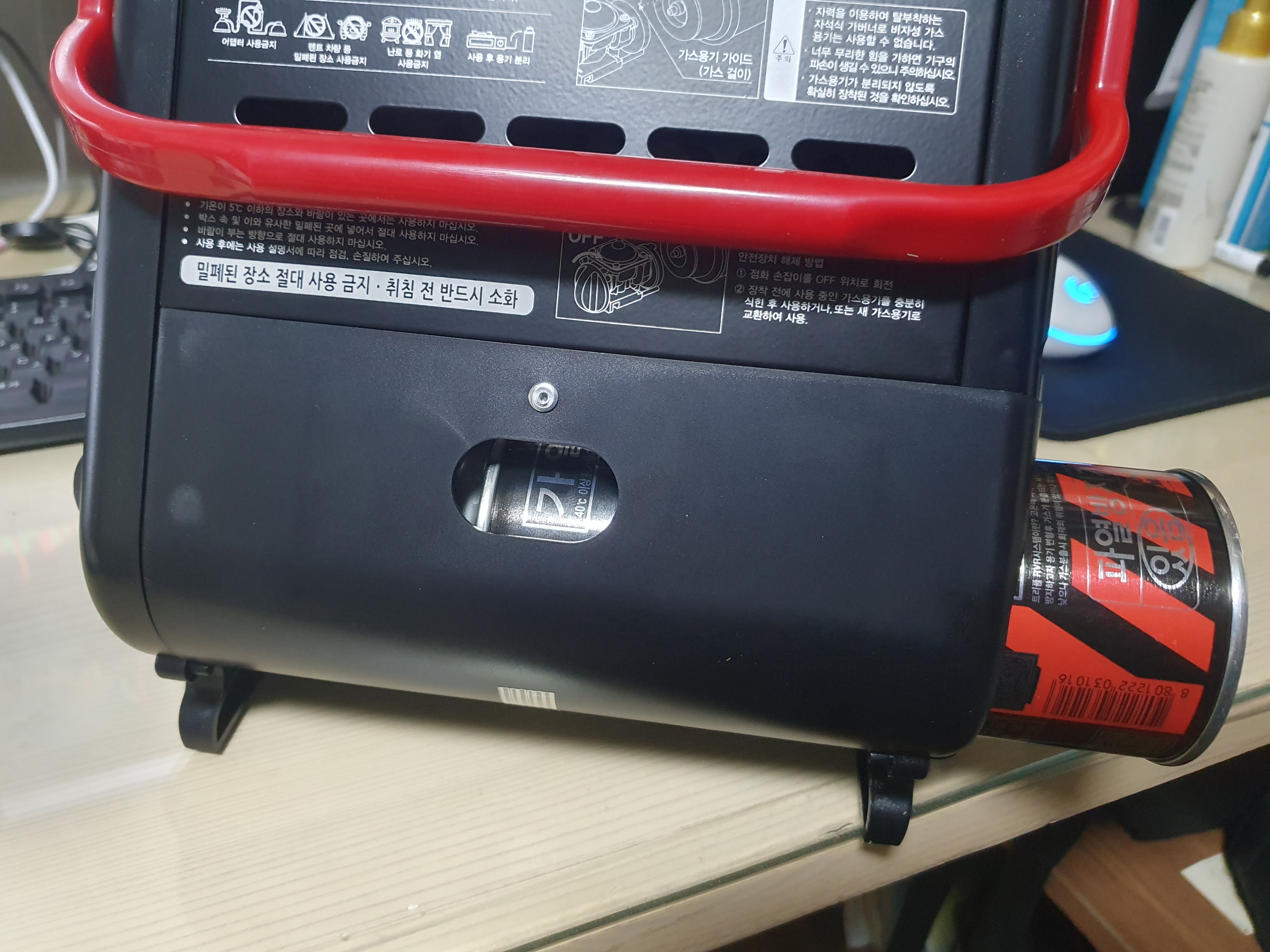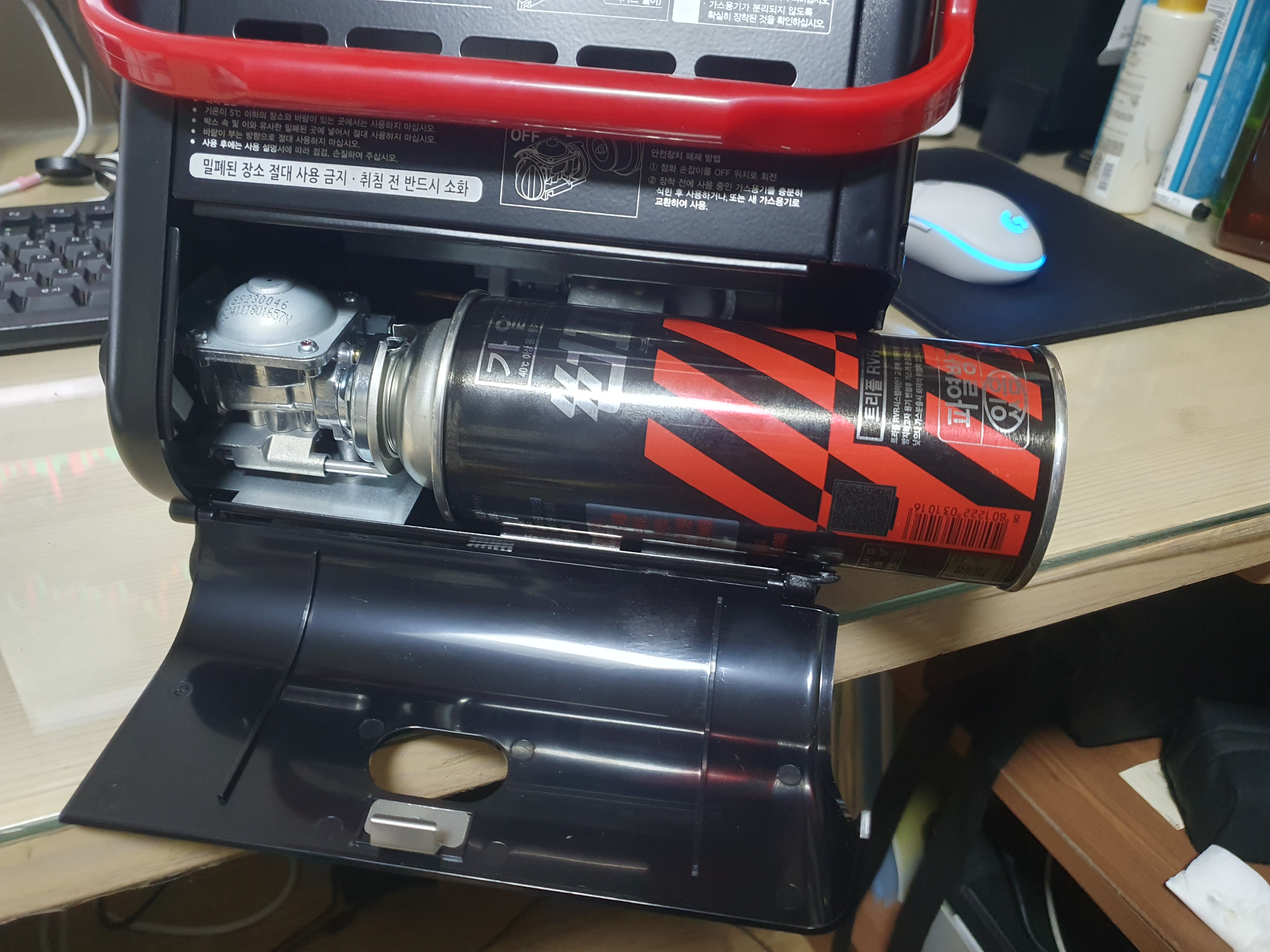 히터 뒤쪽에 부탄가스를 꽂고 버너를 켜듯이 레버를 돌리면 난로가 켜진다. 역시 저출력 전기난로와는 차원이 다른 화력이 느껴진다. 가스소비량은 시간당 75g이라고 하니 220g짜리 부탄가스면 최고출력으로 3시간 정도 사용이 가능할 듯하다.